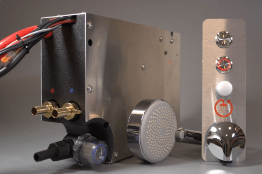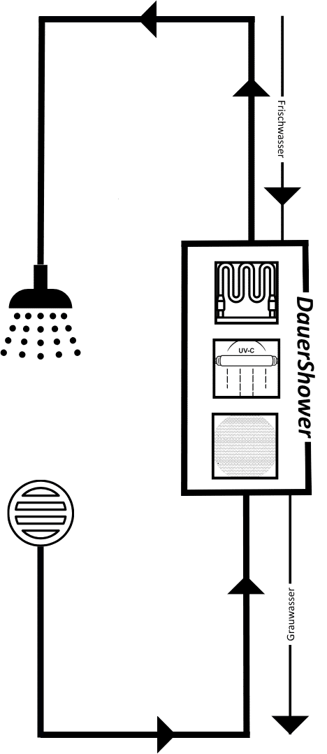 Die DauerShower arbeitet mit einem geschlossenen Wasserkreislauf. Das Duschwasser wird kontinuierlich gefiltert, desinfiziert und auf konstanter Temperatur gehalten. So bleibt der Wasserdruck angenehm gleichmäßig, ohne zusätzlichen Wasserverbrauch.